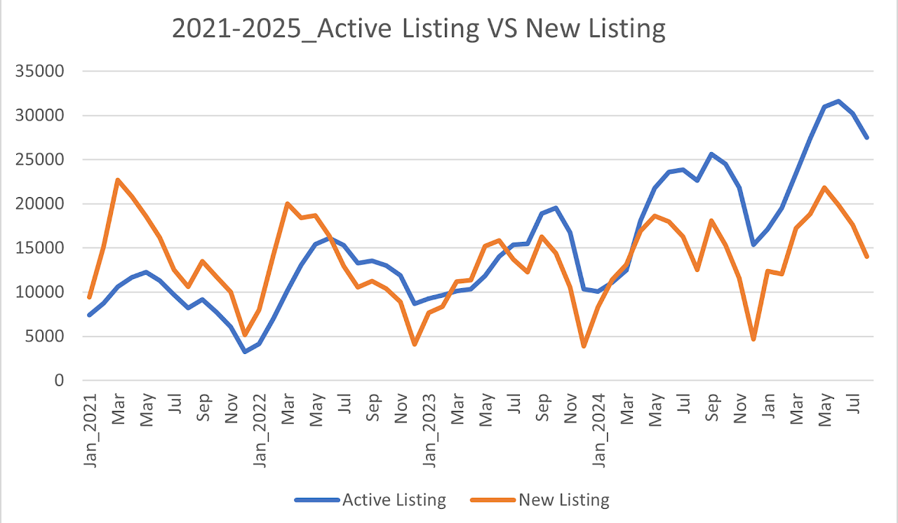 실제로 현장에서도 보면, 9월 초를 지나면서 쇼잉하는 빈도와 리스팅되고 있는 매물들이 증가하면서 거래도 다소 증가하는 모습입니다. 즉, 아래의 그래프에서도 확인할 수 있듯이, 가을시장에는 신규매물과 재고량도 함께 증가하면서 거래량도 증가할 것으로 전망됩니다.