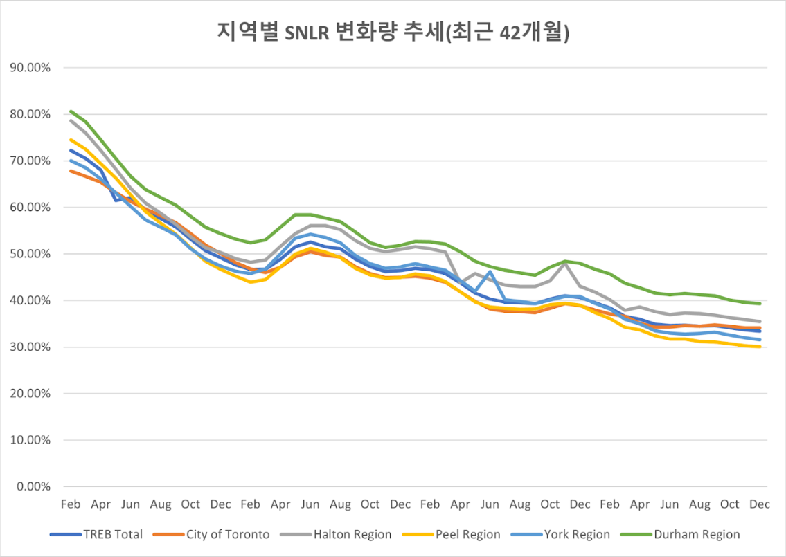 그리고 이번에는 SNLR 변화량을 살펴보면, 지역에 따라서 조금씩 차이는 있지만 작년 6월 지나면서 크게 완만해 진것을 확인할 수 있습니다. 특히 City of Toronto 경우에는 거의 바닥을 계속 유지하고 있는 모습을 관찰할 수 있구요.