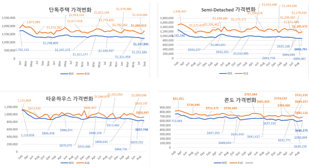 또한 지난 8월까지 전체적으로 하락세 였던 주택유형별 주택가격이 토론토중심(416지역)으로 상승세로 전환된 모습을 확인할 수 있습니다. 특히, 단독주택의 상승폭이 다른 주택유형 보다 크게 상승하면서 전반적인 주택평균가격 상승폭의 가장 큰 원인으로 작용한 것으로 나타났습니다.